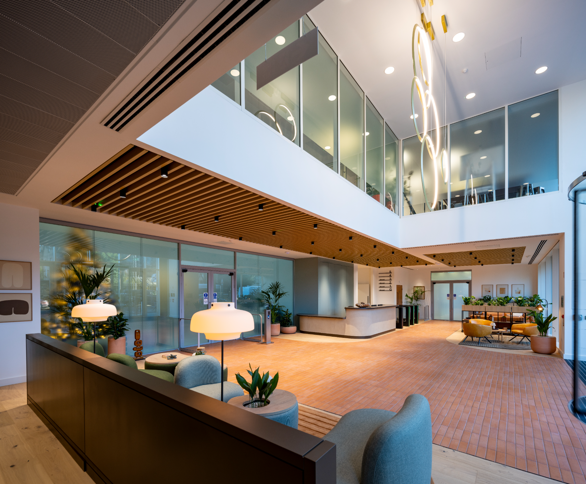 A key part of the project was our close partnership with architect Suttonca, and together we worked hand in hand to ensure every finish, layout decision and access requirement was fully coordinated. This included material selection, lighting, and spatial planning, all of which were carefully considered to create a warm, hospitality‑led reception that meets operational, accessibility and aesthetic needs without affecting neighbouring offices.