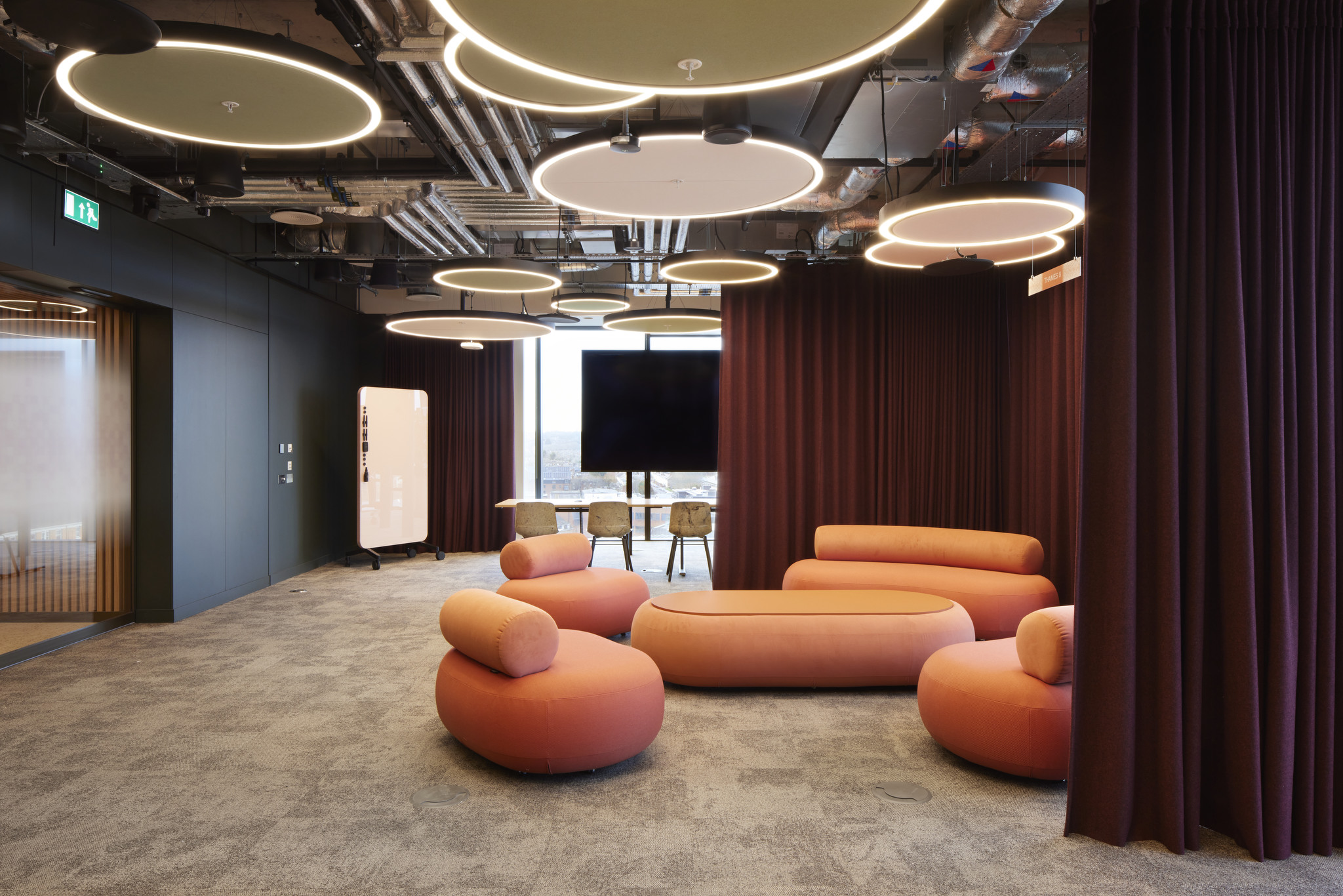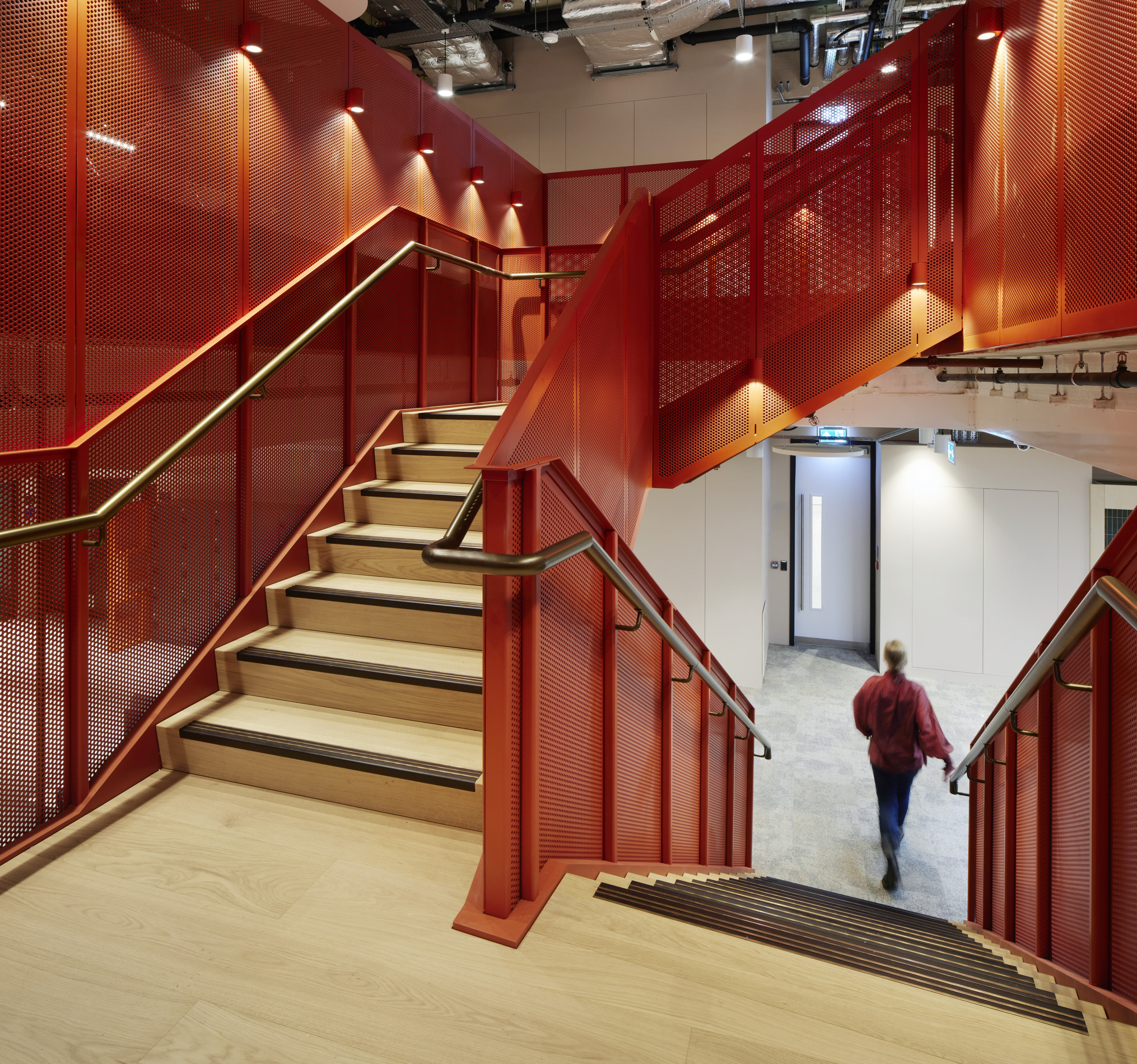 A standout element is the striking interconnecting staircase, completed alongside a fire curtain installation as landlord works, adding bold visual centrepiece to the space.