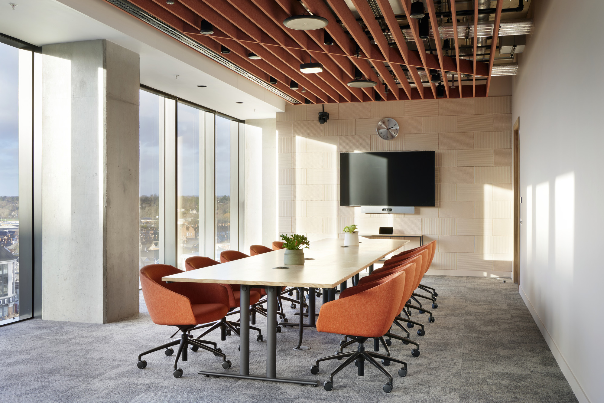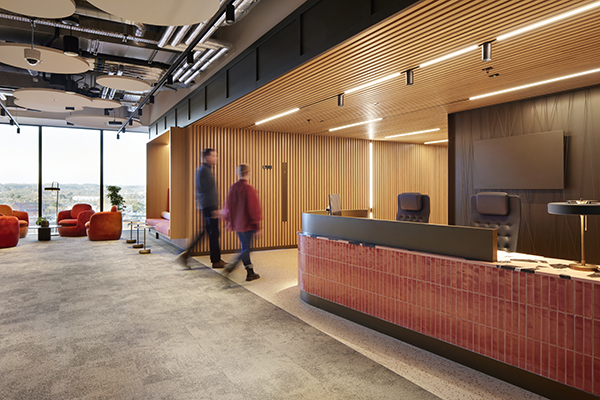 The fit out showcases several bespoke details, from a timber-slatted corridor to custom joinery and a tailor-made reception desk. But the real showstopper is the staircase, timber clad, made from perforated metal, it’s finished in vibrant wet-sprayed orange with integrated lighting, making a memorable impact. Acoustics is another dominant feature throughout the space with rafts, baffles and wall panelling – all sympathetic to the offices modern design.